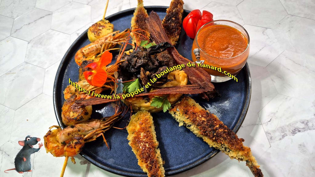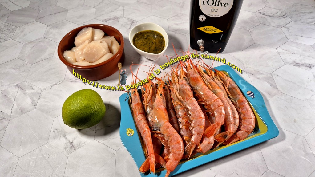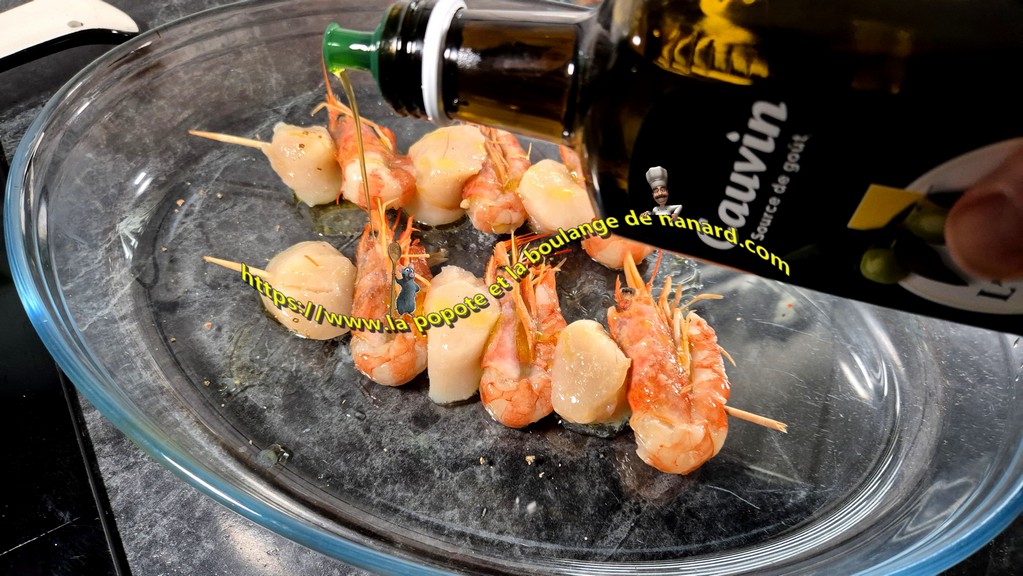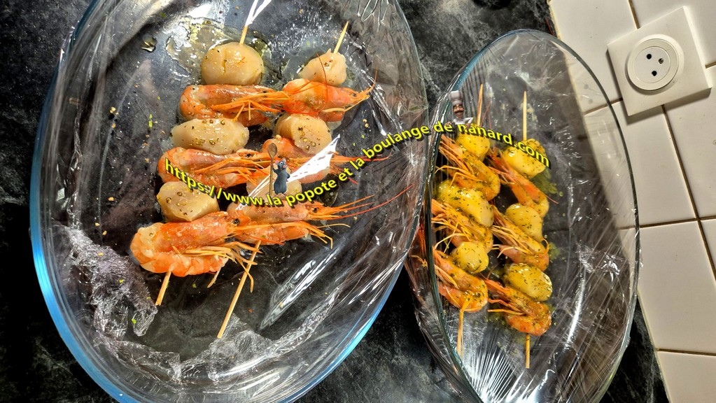 - Confectionner quatre brochettes avec sur chacune d'elle trois noix de St Jacques et trois gambas.
