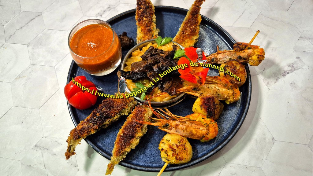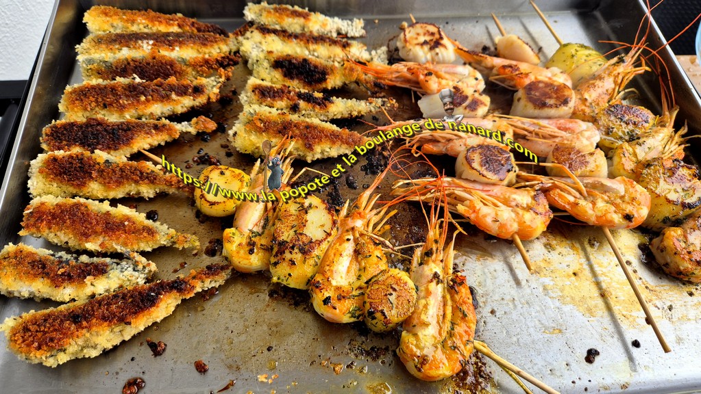 Brochettes de St Jacques & gambas, sardines à la plancha