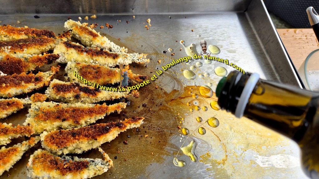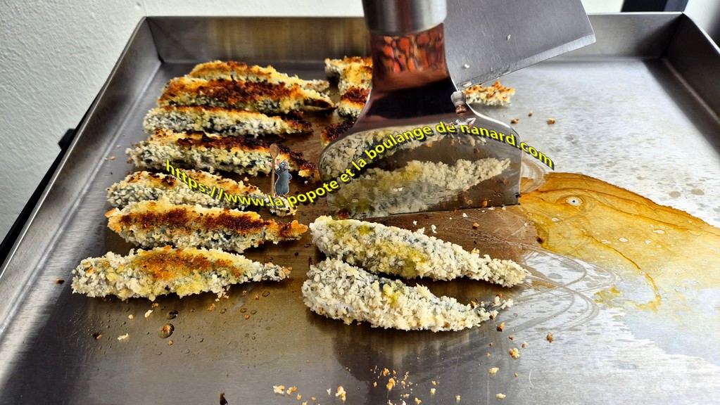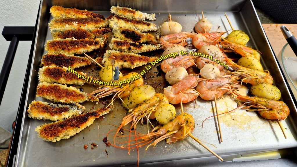 Il n'est pas évident de cuire à la plancha, comme je vous le présente, des aliments panés. Impossible d'effectuer la cuisson sans matière grasse. Comme vous le savez, la chapelure à tendance à absorber l'huile ou le beurre. L'usage d'huile d'olive est ma préférée, pour tous ses bienfaits. Vous pouvez effectuer la cuisson à la poêle, dans un mélange de beurre et d'huile. Faites cuire les sardines et les brochettes deux minutes sur chaque face, comme sur la plancha. La panure doit être joliment dorée, assurant une sardine parfaitement cuite.