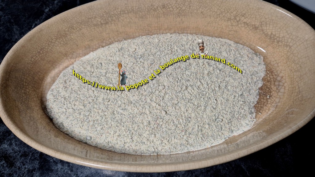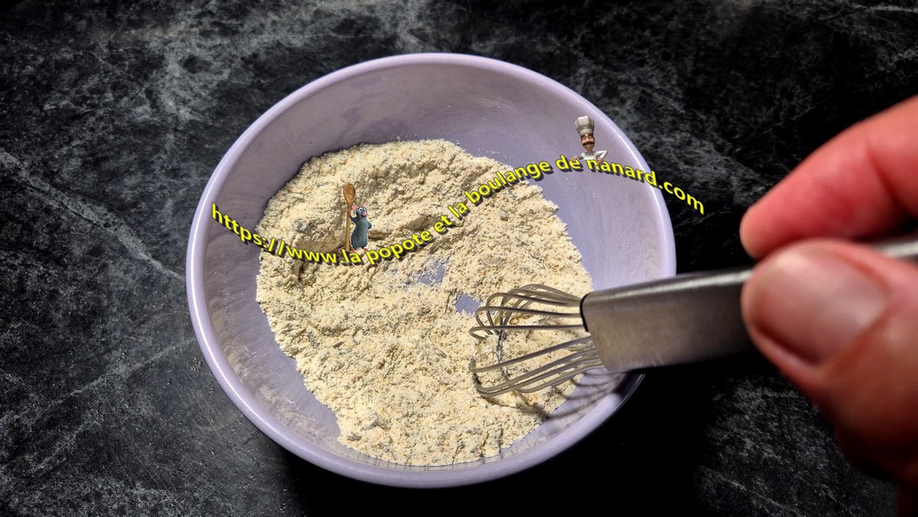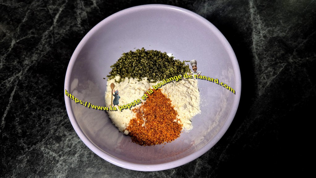 - Rassembler dans un ravier la farine, le piment d'Espelette et le mélange secret d'arômes. Mélanger l'ensemble avec un petit fouet puis le verser dans un plat creux.