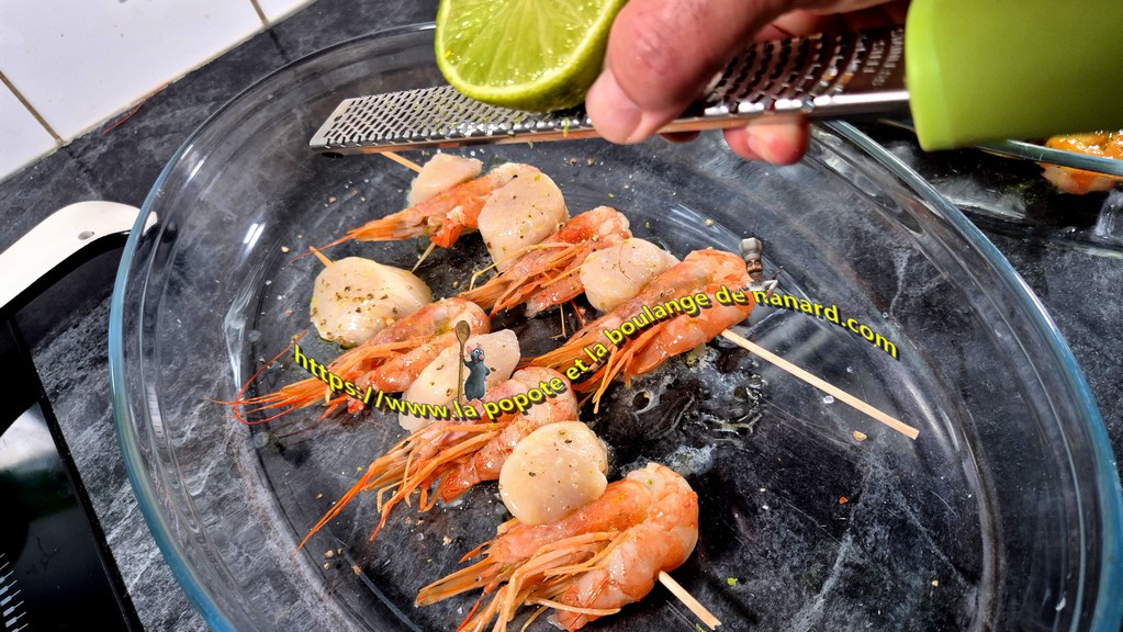 - Saler puis poivrer les deux autres brochettes sur les deux faces. Arroser d'un filet d'huile d'olive et du jus du citron puis zester dessus l'autre moitié du citron vert.