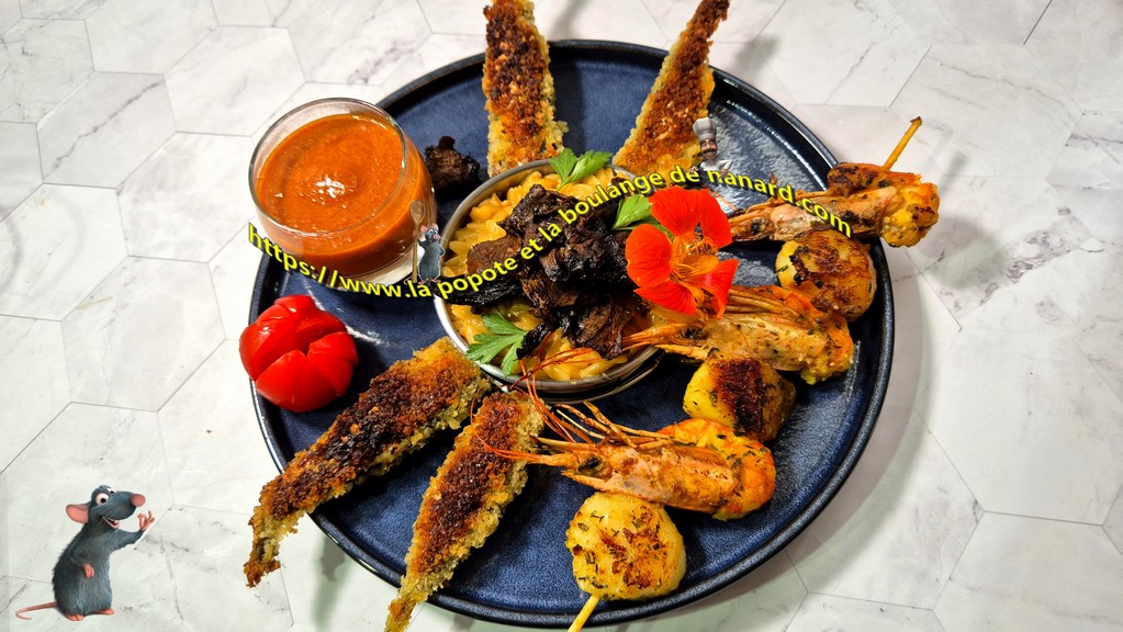Je vous présente ma sauce au chorizo, qui a parfaitement agrémenté mon assiette terre-mer. Pour rappel, mon plat était composé d'un risotto terre-mer, de brochettes de gambas et noix de Saint-Jacques, puis enfin de sardines panées. Ces produits de la mer étant cuits sur une plancha, lorsque la saison le permet.