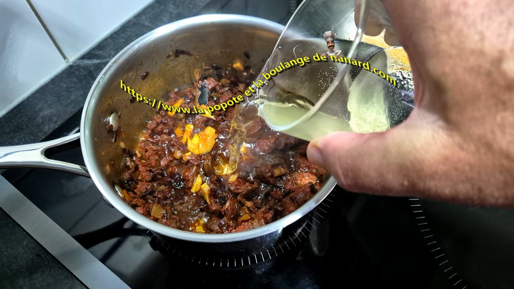 - Verser le vin blanc puis le laisser réduire de moitié.